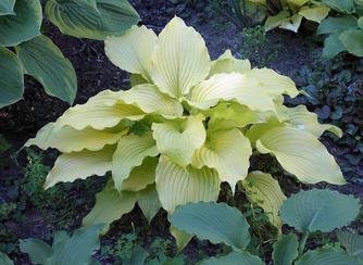 Bright yellow foliage is broad and wedge-shaped with a rippled edge. Turns pale yellow later in the season. Pale lavender flowers in mid-summer.